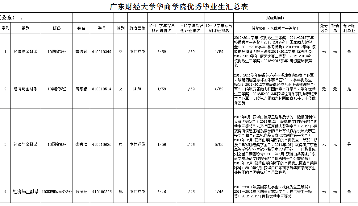 为表彰在德、智、体等方面全面发展和表现突出的毕业生,激励广大学生刻苦学习、奋发向上,学院决定在2014届全日制普通本科毕业生中评选优秀毕业生。根据学院通知精神,按照《优秀毕业生评选奖励办法》文件规定,由学生申请,系部评审,评选出经济与金融系 2014届本科优秀毕业生4名,名单公示如下: