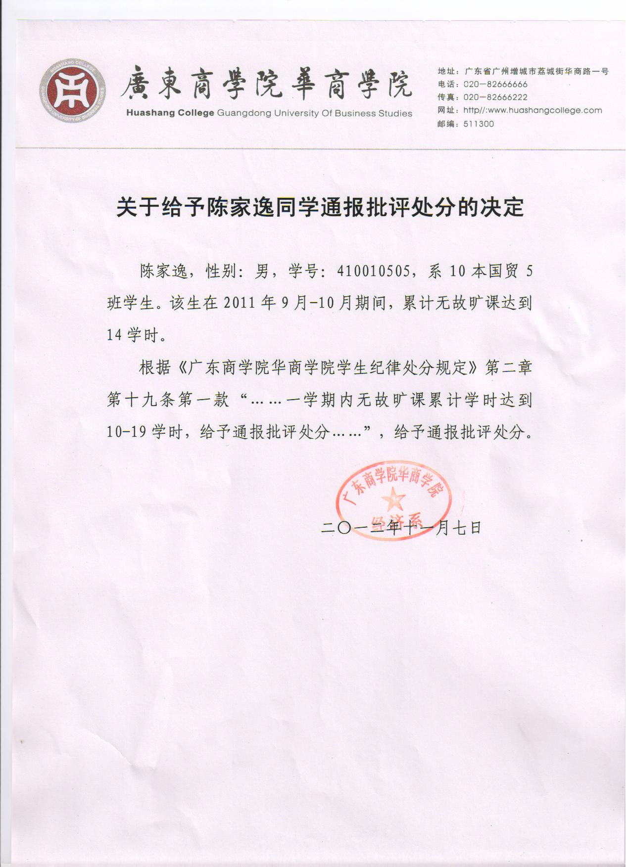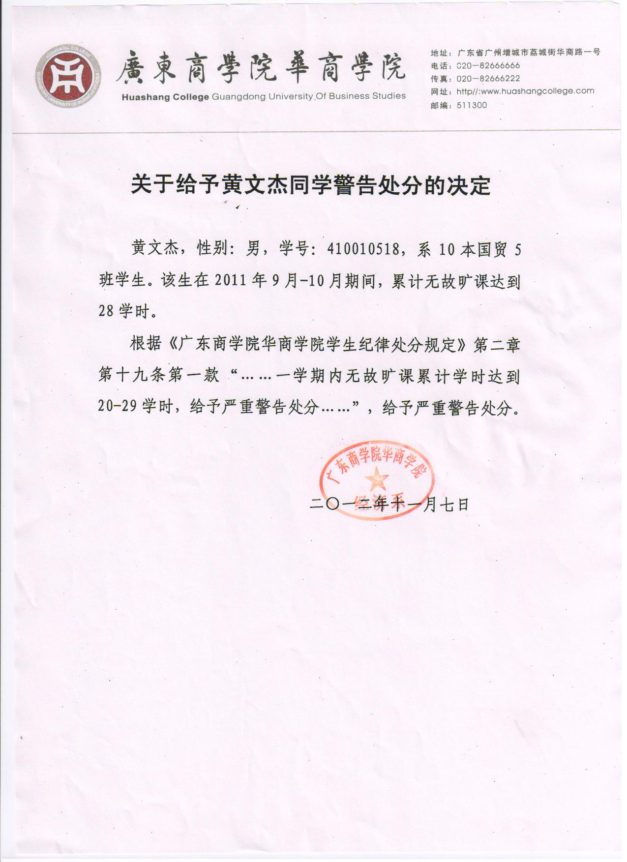 2012-2013学年上学期10月给予黄文杰等五位同学处分公告