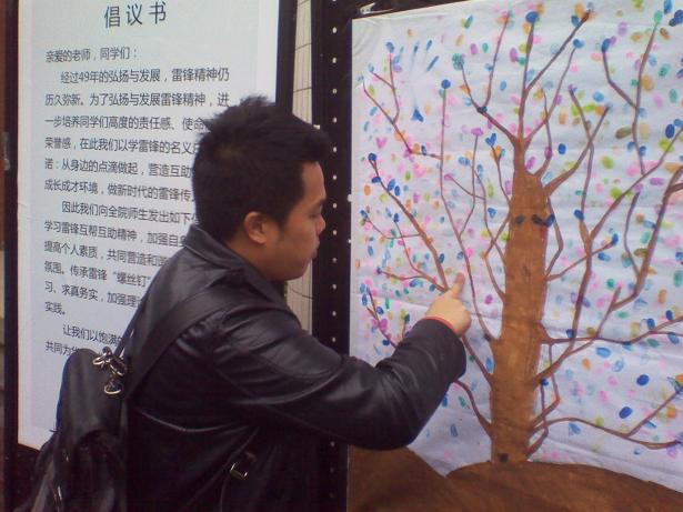 宣传版前,同学们络绎不绝,纷纷前来观看雷锋事迹与安全知识;并且染上五颜六色的颜料将手模按到画有树干的“大树”上,以示支持雷锋精神和安全教育的宣传。更值得一提的是,刘苗老师和杨思佳老师在百忙之中抽空,参加我们的活动。在活动的尾声,老师和同学们在五彩缤纷的大树上按下手模,为本次活动画上圆满句号。