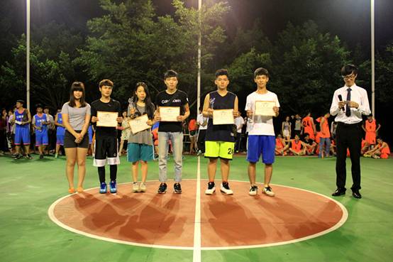 恭喜13级金工3班的杨宇铭师兄、14级国商班的莫宏滔同学以及13级国贸7班的胡鹏、余永豪、杨小璇团队分别获得了全明星三分大赛冠军、技巧大赛冠军以及投篮之星团队冠军。13级金工4班和14级统计班获得男子篮球精神文明奖.恭喜13级国贸9班和12级国贸3班分别获得本次级篮球赛的男篮和女篮季军。12级国贸8班和13级国贸8班分别获得男篮和女篮亚军。12级国贸3班和12级国贸5班分别获得了最终的男篮和女篮冠军,为他们颁奖的是经济与金融系团学书记宋元跃老师。当然,少不了男篮和女篮MVP的奖项,获得这两项大奖的是叶照阳师兄和黄倩雯师姐,为他们颁奖的是团学副主席苏嘉慧师姐。