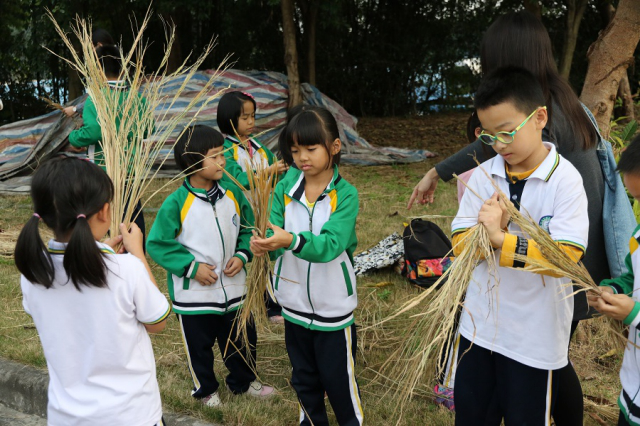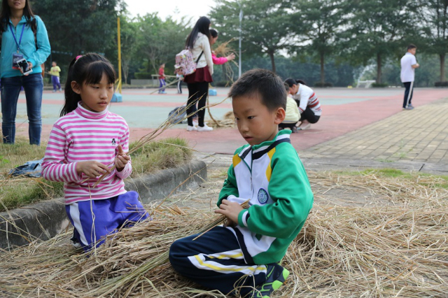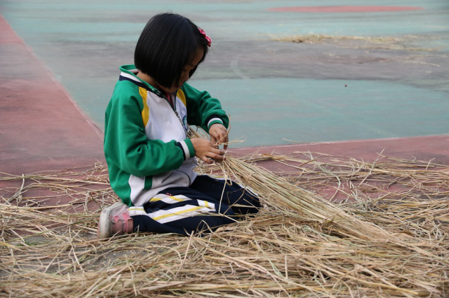 一捆捆干枯的杂草摆放在绿草地上,就像是一个个可爱的稻草人。孩子们看见稻草后,马上兴奋得蹦蹦跳跳的。然而此时的稻草还只是一堆未成型的杂草,要怎样才能把面前的这堆稻草编织出各具特色的造型呢?经过一番商讨后,志愿者们先手把手地教孩子们把散乱的稻草像编辫子那样编成一条条“麻花辫”,然后再利用这些结实的“辫子”摆出各种造型,有些手巧的孩子很快就学会了,于是志愿者们干脆让这些孩子当小老师,让他们帮一把那些还未学会编织的孩子们,使他们在学以致用的同时,也收获了一份欢乐。为了使稻草模型更具特色,志愿者们灵活地使用工具,把长长的竹子砍成一截一截的,然后再把它们用于构建模型,这其中的过程真是趣味无穷。