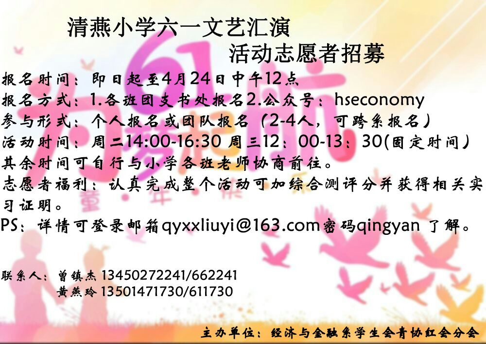 活动内容: 为庆祝一年一度的国际六一儿童节,经济与金融系学生会青协红会分会将联合清燕小学一起举办六一汇演活动。参与活动的志愿者与小学生们一起排练六一汇演的表演项目,表演项目主题为清燕校歌比赛,形式可以是小组唱、领唱、跟唱、合唱,可以伴舞(但舞蹈不能喧宾夺主)