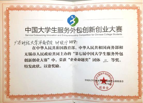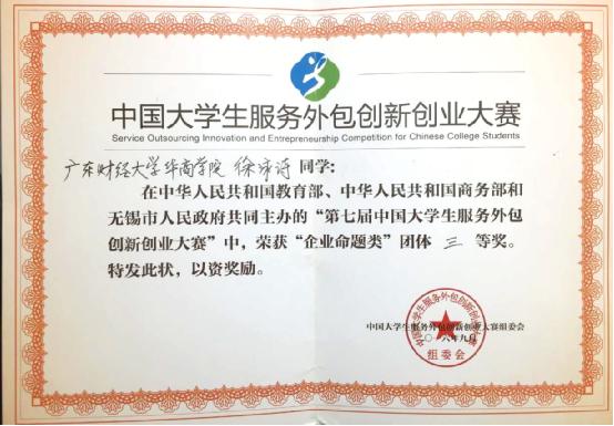 我系15级金工八班徐泳诗、15级国贸7班叶晓宁在第七届中国大学生服务外包创新创业大赛中,荣获“全国三等奖”。
