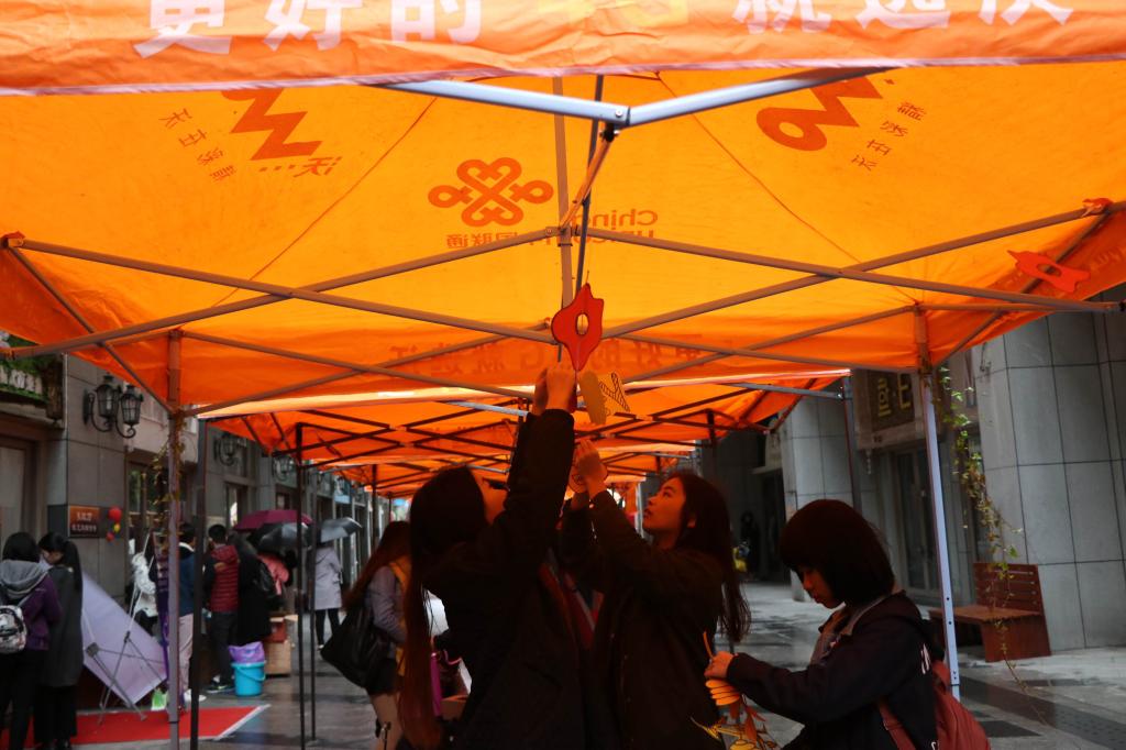 精致的呈现,只因有背后的默默付出,在各位工作人员冒雨布置好现场后,步行街出现了一顶顶橙色的帐篷,在风雨下增加了一抹靓丽的风景。