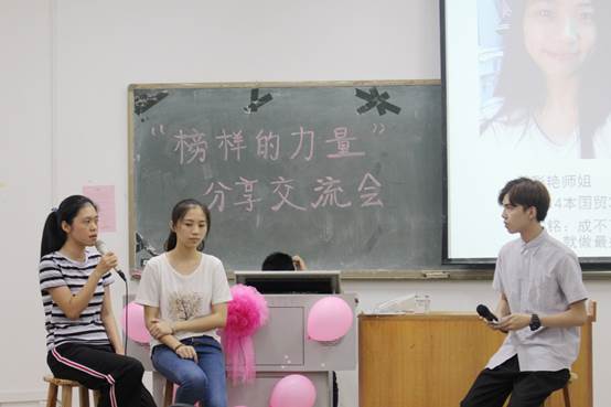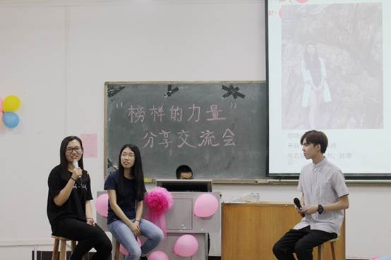 14本国贸3班黄彩艳和15本国贸3班杨珊珊的分享更是别出心裁,她们就校园活动和社会实践展开了此次分享。为了增加本次交流会的气氛,黄彩艳还对室友进行爆料,吸引到台下观众的注意,现场的气氛一度被推向高潮。杨珊珊则对室友表现感谢,感谢大家互相激励,互相影响。玩笑之余,榜样们都提出了自己下个阶段的目标,并说明付诸努力的方式。
