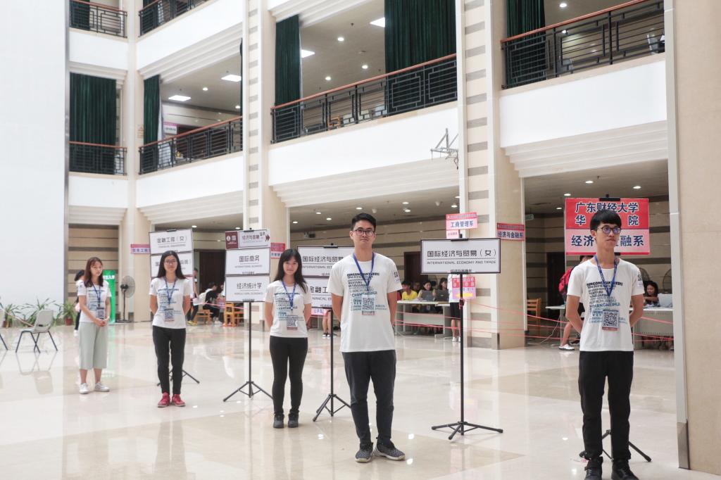 华商各个校道、图书馆门口、迎新大本营等各工作点随处可见我系志愿者和工作人员,他们身着黄色、白色或粉色的统一衣服,忙碌地做着准备工作。他们搭帐篷,搬桌椅,领物资,一起认真工作着,只为保障新生报到注册顺利进行。