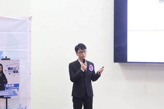 看完选手们信心满满的宣战视频后,选手们依次上台对自己事先准备的PPT进行演讲。他们从容不迫地进行自我介绍和PPT演讲。有合理的规划才能更好的实施,他们凭借专业知识来对大学四年和未来的就业进行规划。他们都拥有独特的职场看法,不仅对自我定位有着充分的认识,而且有着足够的自信能在职场中临危不乱的处理问题。演讲中,他们无不落落大方、激情满满,拥有清晰的目标和强大的能力注定让他们在职场中脱颖而出。