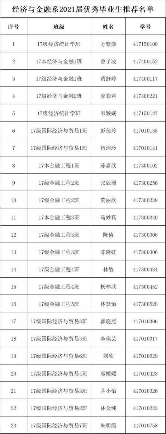 根据学校《关于认真开展评选2021届优秀毕业生工作的通知》文件精神,各班级认真组织2021届优秀毕业生评选工作,经学生自主申请,系部评审,我系优秀毕业生评选小组复核共评出方紫璇等22名优秀毕业生候选人。现对推荐的经济与金融系2021届优秀毕业生进行公示,公示期为2019年5月20日至5月23日。