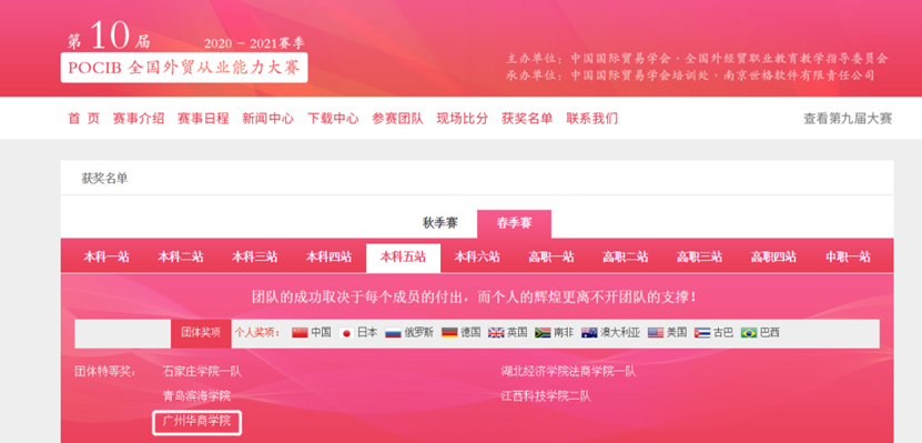 第十届POCIB全国外贸从业能力大赛(春季赛)共有210所院校(其中本科144个学校,高职62个学校,中职4个学校)、429支队伍、共计4290名选手参加。在指导老师黄丽霞、明小晴的带领下,经济与金融系10位参赛学生以团队第五的成绩,荣获团体特等奖,实现大赛二连冠!