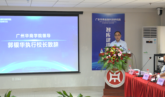 郭银华执行校长代表学校致辞。他指出由刘少波教授领衔的广东华商金融科技研究院申报获批广东省普通高校特色新型智库,是我校在高端研究平台建设上的一次历史性突破,对我校科学研究特别是金融学科发展,必将产生积极作用和深远意义。他强调金融学科特别是金融科技专业是华商学院今后重点发展的学科专业之一,要致力在国内占有重要的一席之地。