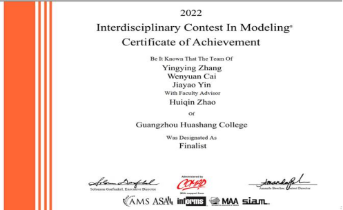 近期,2022年美国大学生数学建模成绩揭晓,我院19金融工程专业张盈盈同学及其参赛团队(指导老师:赵慧琴),于今年2月18日-22日参加美国大学生数学建模竞赛,获得F奖(特等奖提名)。这也是目前我们学校的最好成绩。 美国大学生数学建模竞赛(MCM/ICM),简称“美赛”,由美国数学及其应用联合会主办,是唯一的国际性数学建模竞赛,也是世界范围内最具影响力的数学建模竞赛,迄今已成功举办过30余届。赛题内容涉及经济、管理、环境、资源、生态、医学、安全、等众多领域。参赛队由以1-3 名在校本科生组成,不允许跨校组队,同时配一名指导老师。竞赛要求三人(本科生)为一组,在四天时间内,就指定的问题完成从建立模型、求解、验证到论文撰写的全部工作,体现了参赛选手研究问题、解决方案的能力及团队合作精神,为现今各类数学建模竞赛之鼻祖。 美国大学生数学建模竞赛目前分为两种类型,MCM(Mathematical Contest In Modeling)和 ICM(InterdisciplinaryContest In Modeling),两种类型竞赛采用统一标准进行,竞赛题目出来之后,参数队伍通过美赛官网进行选题,一共分为 6 种题型。其中,MCM下设“连续型”、“离散型”、“大数据”三种题型,ICM下设“运筹学/网络科学”、“环境科学”、“政策”三种题型。获奖比例奖项分为五个层次(由高到低):特等奖(Outstanding Winner:<1 %)、特等奖提名(Finalist:2%)、一等奖(Meritorious:6%)、二等奖(HonourableMetion:22%)、成功参与奖(Successful Participant:66%)。 通过这次数学建模比赛,参赛的同学都表示收获颇多。他们觉得通过比赛不仅锻炼了他们的英文写作能力,而且也提高了团队合作能力和运用所学数学、概率、统计学等课程知识分析解决实际问题的能力。恭喜张盈盈同学及其获奖团队,祝愿伟德国际VICTOR1946未来涌现更多优秀的同学取得更好的成绩。