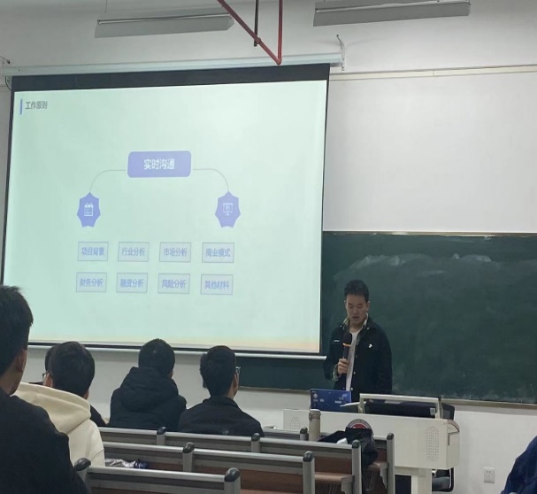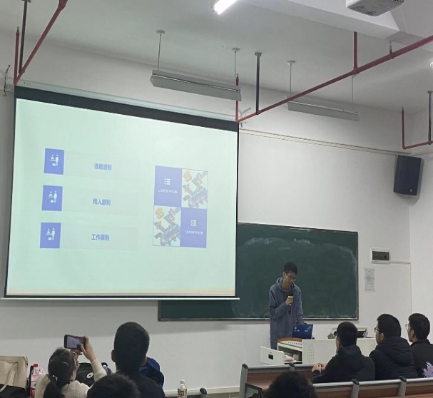 接着,20本金融工程3班杨皓然同学和19本金融工程5班胡帝同学分别分享了他们过去参赛的经验。杨皓然同学主要从参赛目的,市场调查,技术层面以,选人层面和工作层面分享了自己的看法。胡帝同学则分享了参赛的好处,除了获得了很多锻炼,包括写计划书,包装产品或者服务,与组员的沟通共事,对以后课程的学习,还有就是参赛获奖的情况下学业上可以加分,还能获得奖金的奖励。