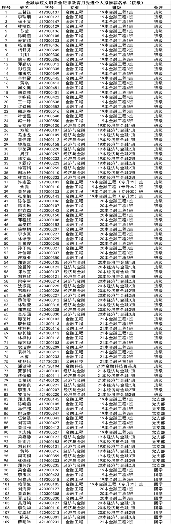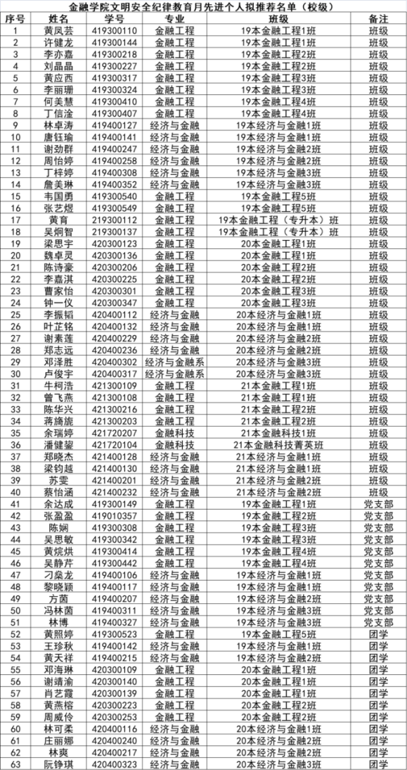 为表彰在2022年“文明安全纪律教育月”活动中行动积极、表现优秀的班集体以及先进个人,1946伟德国际源自英国开展了“文明安全纪律教育月评选”活动。通过自荐参评的方式,经过伟德国际VICTOR1946评选审核,秉着公平、公正和择优的原则,现拟推荐19本金融工程1班等4个班集体为校(院)文明安全纪律教育月先进班集体,黄凤芸等172名同学为校(院)文明安全纪律教育月先进个人,现将拟推荐名单公示如下。