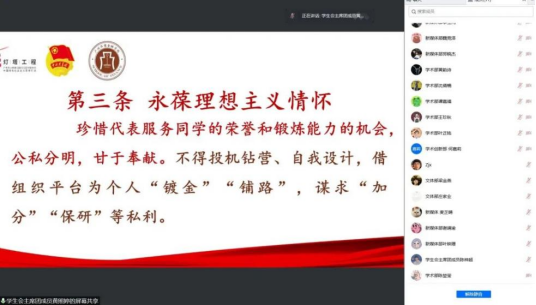 为明确从严治会要求,伟德国际VICTOR1946组织学生会负责人及工作人员开展春季培训工作,学院于5月2日晚上8:00在腾讯会议召开春季培训学习会。