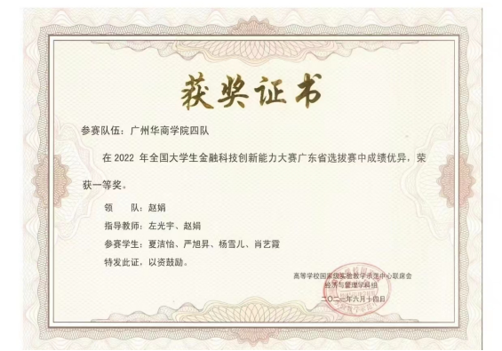 金融科技专业教师指导学生团队荣获2022年全国大学生金融科技创新能力大赛广东省选拔赛 一等奖。