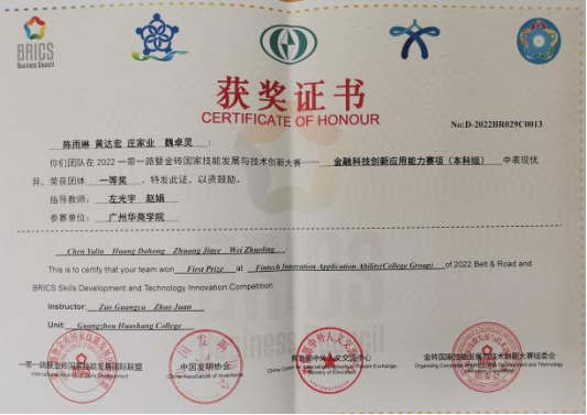 金融科技专业教师指导学生团队荣获2022一带一路暨金砖国家技能发展与技术创新大赛——金融科技创新应用能力赛项(本科组)一等奖。