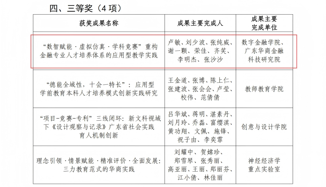 党建领航聚合力 数智赋能结硕果 ——我院卢敏老师带领的教学团队荣获校级教学成果奖三等奖 5月8日,在我校教学成果奖评选中,由党员教师卢敏副教授带领的教学团队凭借《“数智赋能·虚拟仿真·学科竞赛”重构金融专业人才培养体系的应用型教学实践》项目在全校22份申报项目的评选中脱颖而出,荣获校级教学成果奖三等奖。这一成果不仅彰显了党建引领下教学改革的显著成效,更展现了我院教学团队在数字金融专业人才培养领域的创新实践与卓越贡献。 在教学团队组建与项目推进过程中,党员教师充分发挥先锋模范作用。卢敏副教授作为团队负责人,以高度的责任感和使命感,将党建工作与教学改革紧密结合。她组织团队成员开展课程思政示范课堂教学活动,围绕教学难题进行研讨,将党的先进理论转化为推动教学创新的强大动力。在项目申报期间,党员教师兢兢业业,从方案设计到资料收集,从数据整理到成果凝练,带动团队成员积极投身教学改革实践。 该教学成果聚焦金融专业人才培养的痛点与难点,以数智技术为支撑,引入虚拟仿真教学手段,构建了“理论+实践+竞赛”三位一体的人才培养新模式。通过虚拟仿真实验平台,学生能够在模拟真实金融场景中进行实践操作,有效提升了专业技能;同时,积极组织学生参与各类学科竞赛,以赛促学、以赛促教,形成了良好的教学反馈机制。在党建引领下,团队成员凝心聚力,经过多年的探索与实践,最终将这些创新举措转化为丰硕的教学成果。 此次获奖是对团队教学改革创新的充分肯定,也是我院党建工作与教育教学深度融合的生动体现。未来,教学团队将以此次获奖为契机,持续发挥党建引领作用,进一步深化教学改革,优化人才培养体系,为培养更多适应时代需求的高素质金融专业人才贡献力量,也为其他专业的教学改革提供可借鉴的宝贵经验,推动学校教育教学质量再上新台阶。