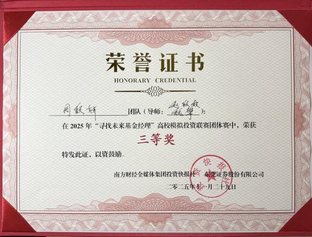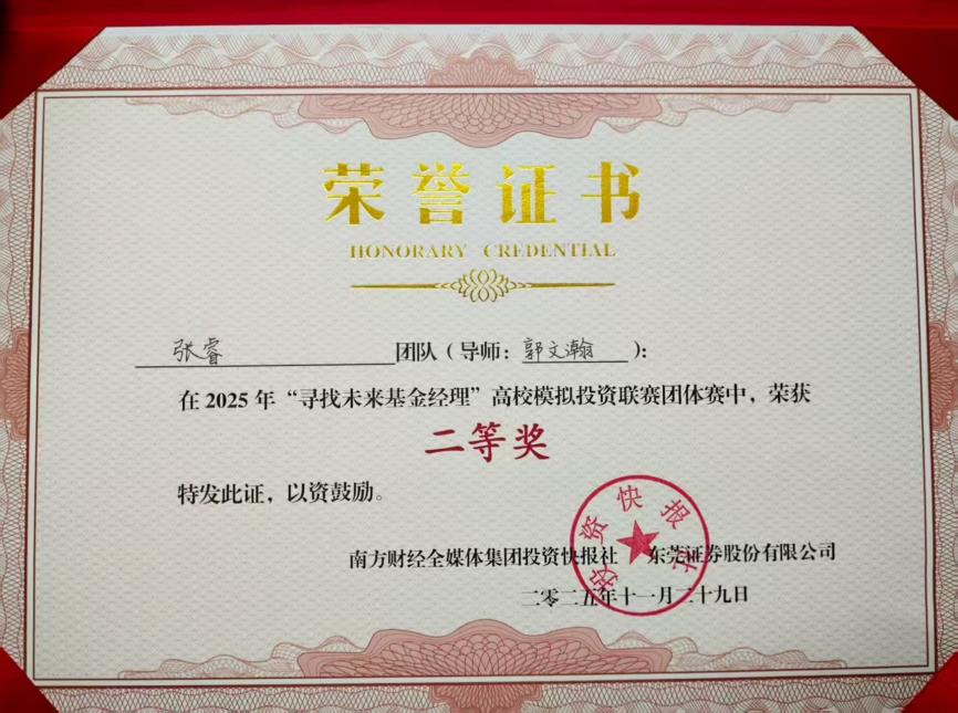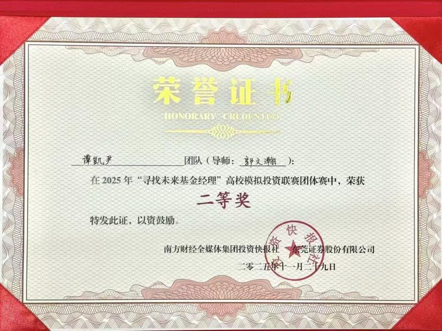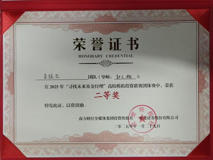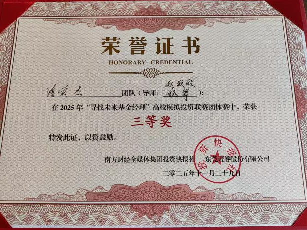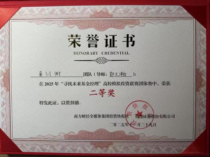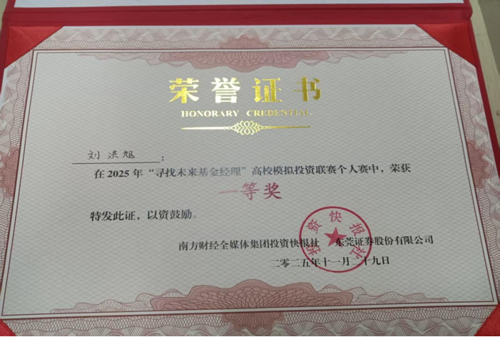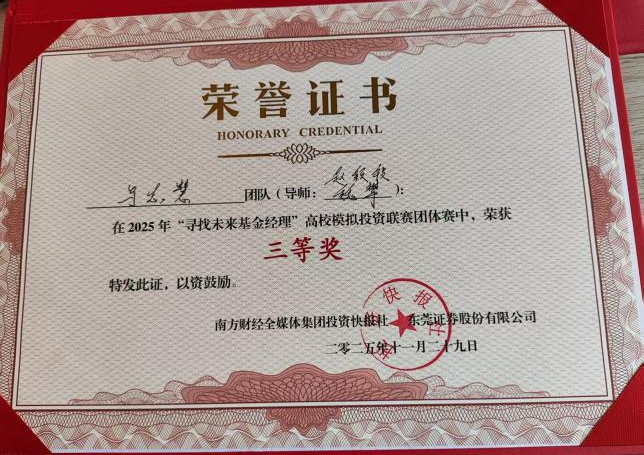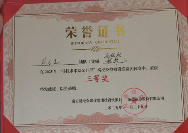 近日,2025年“寻找未来基金经理”高校模拟投资联赛总决赛圆满落幕。1946伟德国际源自英国数字伟德国际VICTOR1946学子在此项大湾区高校金融实践教育的标杆赛事中表现卓越,一举夺得个人赛冠军、团队赛二等奖和团队赛三等奖的优异成绩,充分展现了我院在应用型金融人才培养方面的扎实功底与丰硕成果。 佳绩频传,华商学子闪耀金融赛场 本届赛事由南方财经全媒体集团、东莞证券联合主办,吸引了粤港澳大湾区近4000名高校学子参与。经过为期两个月的初赛、复赛激烈角逐,我院学子在模拟交易、投资策略报告和现场答辩等多个环节中脱颖而出。 尤为瞩目的是,来自我院24级金融科技优才班的刘洪旭同学,凭借其敏锐的市场洞察力和稳健的投资策略,以71.79%的超高收益率在近4000名参赛者中力拔头筹,荣膺个人赛冠军,展现了新生代金融人才的巨大潜力。 在团队赛中,由郭文瀚老师指导的“Haley”团队(成员:黄衍衔、张睿、谭凱尹、李振生) 凭借严谨的逻辑思辨、默契的团队协作和出色的现场答辩,荣获大赛二等奖,其综合素养获得评委一致好评。 由赵颖祯、魏攀老师共同指导的“感动不是心动”团队(成员:潘宏杰、刘子玉、周颖妍、马志慧)同样表现不俗,斩获团队赛三等奖。 精心组织,构建“赛教融合”育人生态 优异成绩的背后,是学院长期以来坚持“以赛促学、以赛促教、赛教融合、校企联动”人才培养模式的生动体现。 精准宣传与高效组织:赛事启动后,学院高度重视,迅速成立由院领导牵头、专业系部和辅导员协同的竞赛工作委员会,面向经管类相关专业进行精准动员和有序组织,确保了参赛工作的顺利推进。 深化产教融合:本次竞赛不仅是学生技能的演练场,更是学院深化校企合作的重要平台。通过参与赛事及相关活动,学院进一步紧密了与南方财经全媒体集团、东莞证券等头部金融机构的联系,为共建“大湾区应用型金融人才培养联盟”、拓展学生实习就业渠道奠定了坚实基础。 展望未来,培育新时代金融英才 本次大赛的丰硕成果,是对我院金融专业教学质量和应用型人才培养成效的一次重要检验。未来,数字伟德国际VICTOR1946将继续总结赛事经验,进一步优化“竞赛-教学-实习”的联动机制,计划通过组建学生竞赛梯队、鼓励跨学科组队、深化与联盟企业的课程共建等方式,不断提升人才培养质量,致力于培养更多符合新时代要求、具备国际视野和创新精神的复合型金融科技人才,为服务大湾区金融产业发展贡献华商力量。